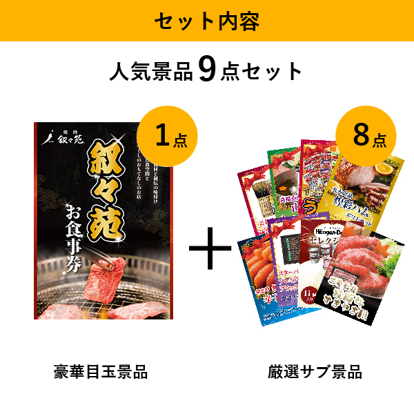 「叙々苑お食事券(1万円分)」が目玉の人気景品9点セットC| 結婚式 二次会 忘年会におすすめ!|景品ならPIARY(ピアリー)