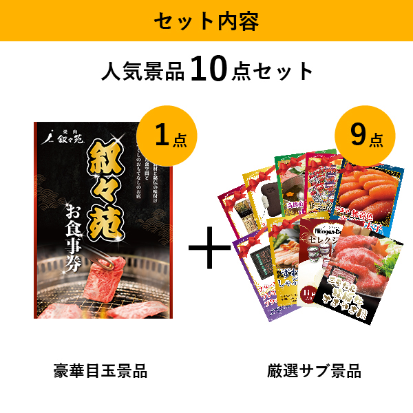 「叙々苑お食事券(1万円分)」が目玉の人気景品10点セットC| 結婚式 二次会 忘年会におすすめ!|景品ならPIARY(ピアリー)
