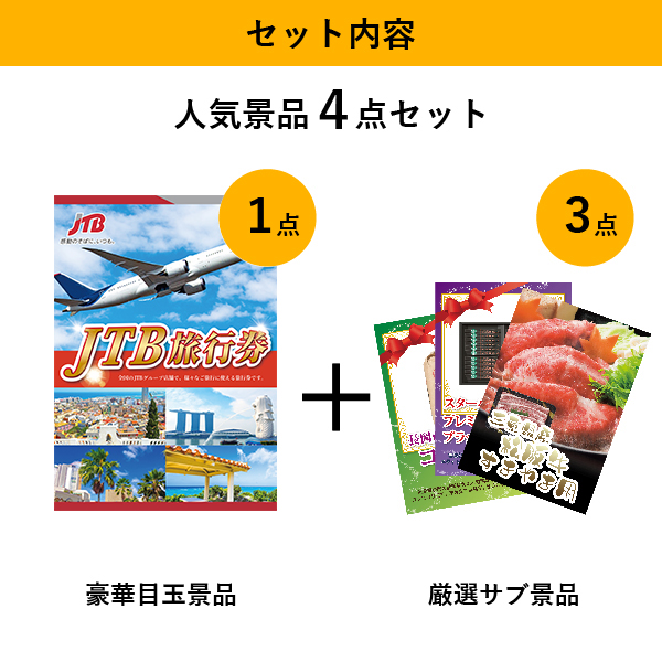 「JTB旅行券(1万円分)」をメイン景品とした、メイン景品1点とサブ景品3点を合わせたセット!
