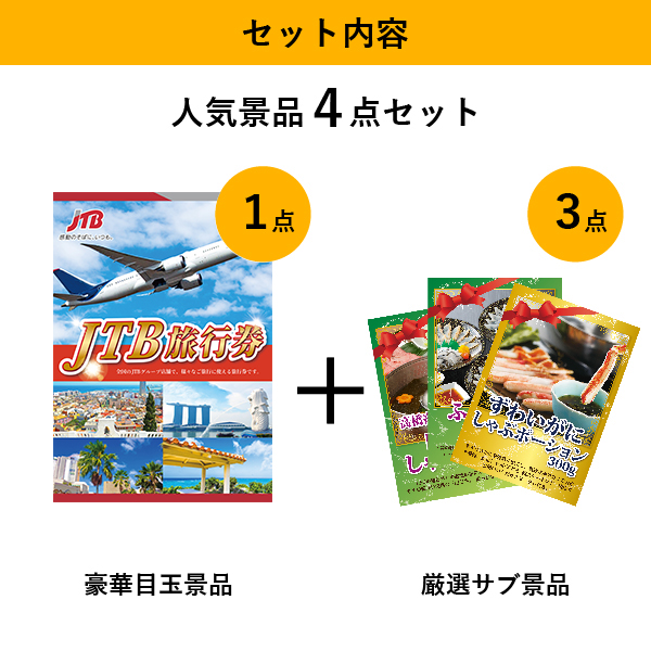 「JTB旅行券(1万円分)」をメイン景品とした、メイン景品1点とサブ景品3点を合わせたセット!