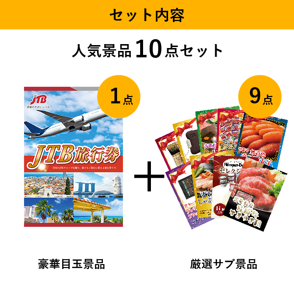 「JTB旅行券(1万円分)」をメイン景品とした、メイン景品1点とサブ景品9点を合わせたセット!
