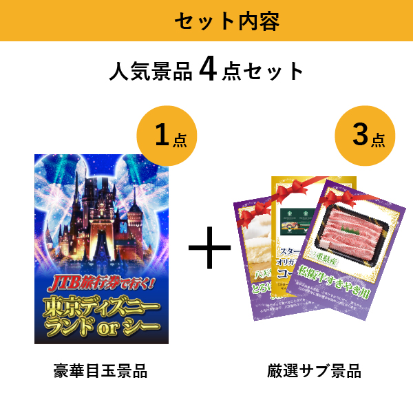 「JTB旅行券(2万円分)で行こうディズニーランドorシー」をメイン景品とした、メイン景品1点とサブ景品3点を合わせたセット!