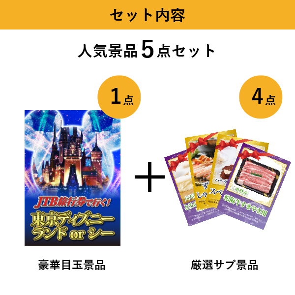 「JTB旅行券(2万円分)で行こうディズニーランドorシー」をメイン景品とした、メイン景品1点とサブ景品4点を合わせたセット!
