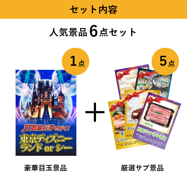「JTB旅行券(2万円分)で行こうディズニーランドorシー」をメイン景品とした、メイン景品1点とサブ景品5点を合わせたセット!