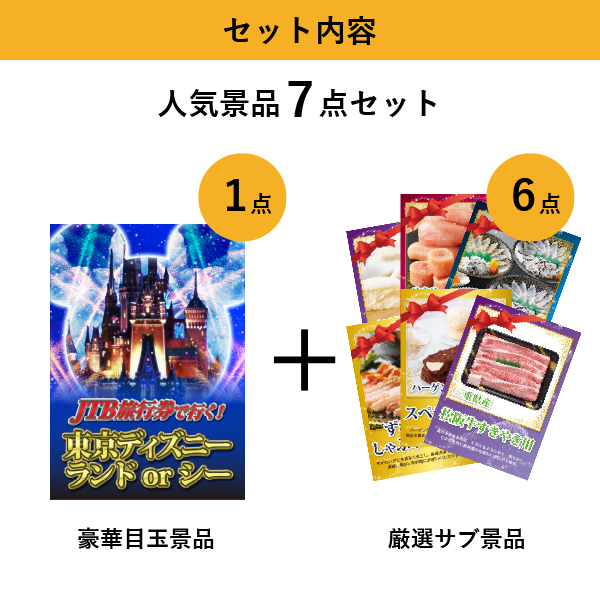 「JTB旅行券(2万円分)で行こうディズニーランドorシー」をメイン景品とした、メイン景品1点とサブ景品6点を合わせたセット!