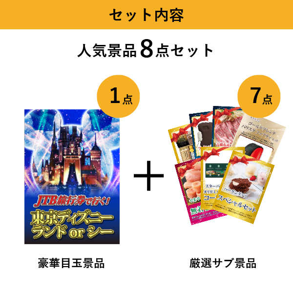「JTB旅行券(2万円分)で行こうディズニーランドorシー」をメイン景品とした、メイン景品1点とサブ景品7点を合わせたセット!