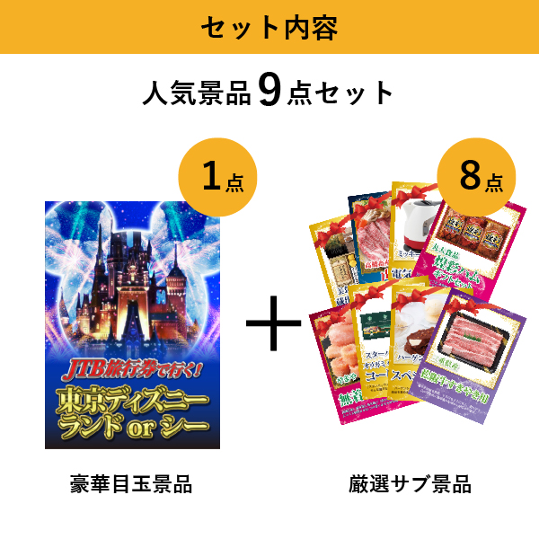 「JTB旅行券(2万円分)で行こうディズニーランドorシー」をメイン景品とした、メイン景品1点とサブ景品8点を合わせたセット!