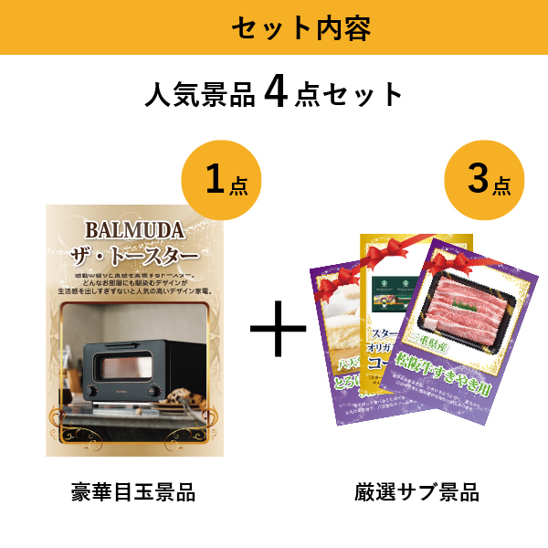 「BALMUDA ザ・トースター」をメイン景品とした、メイン景品1点とサブ景品3点を合わせたセット!