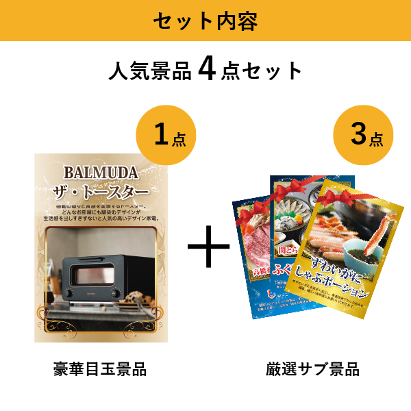 「BALMUDA ザ・トースター」をメイン景品とした、メイン景品1点とサブ景品3点を合わせたセット!