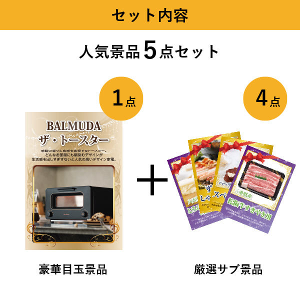 「BALMUDA ザ・トースター」をメイン景品とした、メイン景品1点とサブ景品4点を合わせたセット!