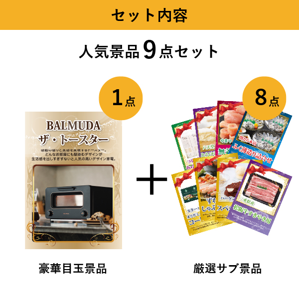 「BALMUDA ザ・トースター」をメイン景品とした、メイン景品1点とサブ景品8点を合わせたセット!