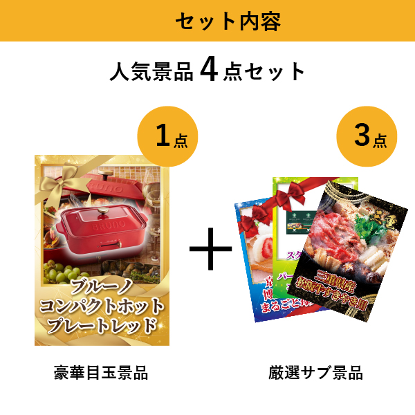 「ブルーノ コンパクトホットプレート レッド」をメイン景品とした、メイン景品1点とサブ景品3点を合わせたセット!