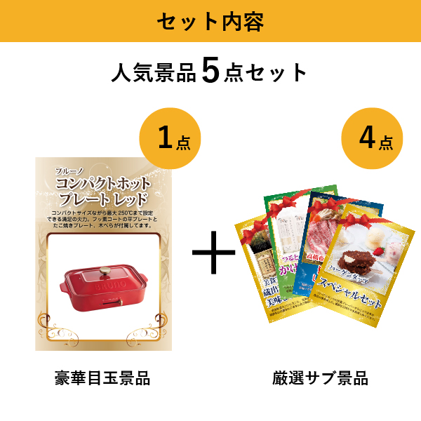 「BRUNO コンパクトホットプレート」をメイン景品とした、メイン景品1点とサブ景品4点を合わせたセット!