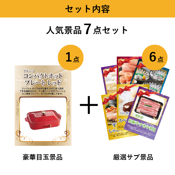 「BRUNO コンパクトホットプレート」をメイン景品とした、メイン景品1点とサブ景品6点を合わせたセット!