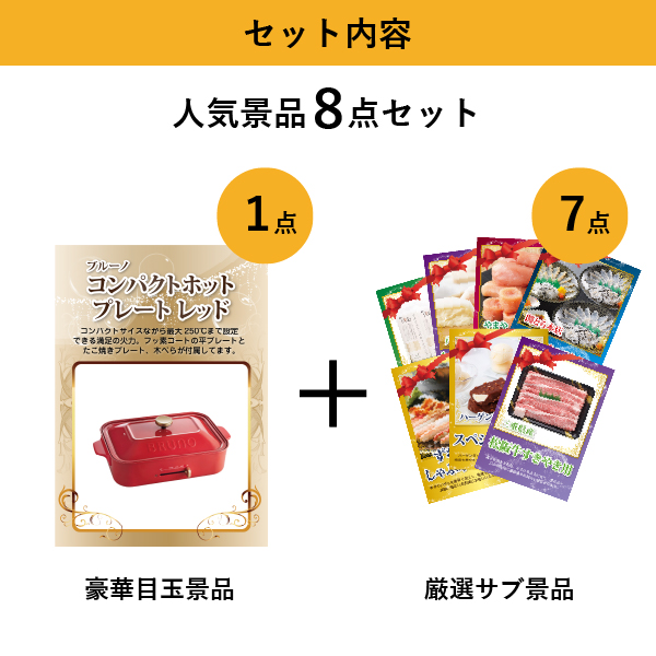 「BRUNO コンパクトホットプレート」をメイン景品とした、メイン景品1点とサブ景品7点を合わせたセット!