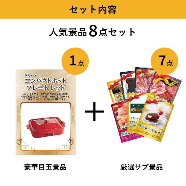 「BRUNO コンパクトホットプレート」をメイン景品とした、メイン景品1点とサブ景品7点を合わせたセット!
