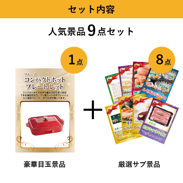 「BRUNO コンパクトホットプレート」をメイン景品とした、メイン景品1点とサブ景品8点を合わせたセット!