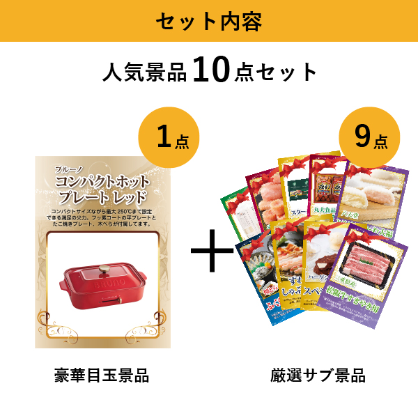 「BRUNO コンパクトホットプレート」をメイン景品とした、メイン景品1点とサブ景品9点を合わせたセット!