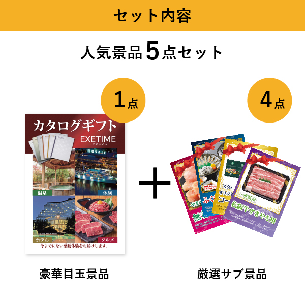 「選べるリゾートホテル・ナイトクルーズ」をメイン景品とした、メイン景品1点とサブ景品4点を合わせたセット!