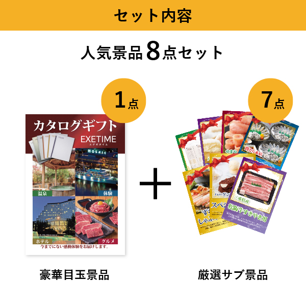 「選べるリゾートホテル・ナイトクルーズ」をメイン景品とした、メイン景品1点とサブ景品7点を合わせたセット!