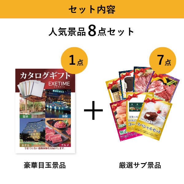 「選べるリゾートホテル・ナイトクルーズ」をメイン景品とした、メイン景品1点とサブ景品7点を合わせたセット!