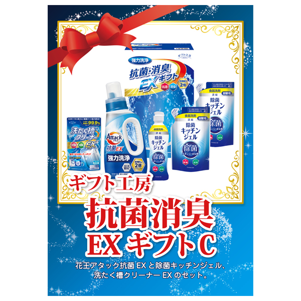 花王アタック抗菌EXと除菌キッチンジェル、洗たく槽クリーナーEXのセット。抗菌・消臭パワーでニオわない快適部屋干し。こだわりの本格消臭ギフトセットです。