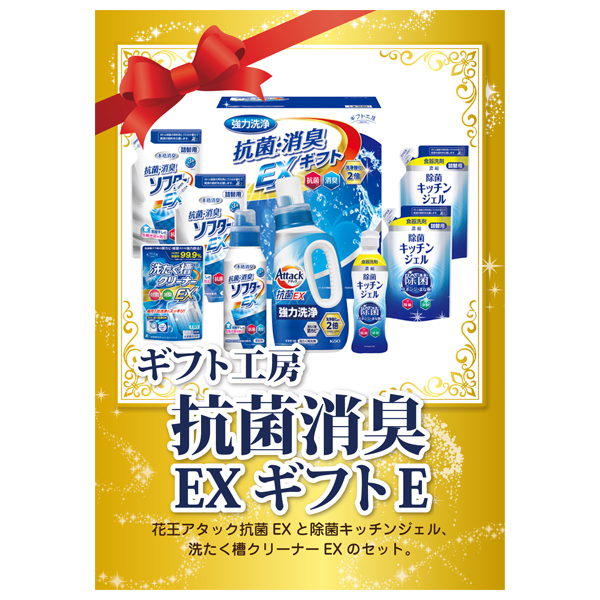 花王アタック抗菌EXと除菌キッチンジェル、洗たく槽クリーナーEXのセット。抗菌・消臭パワーでニオわない快適部屋干し。こだわりの本格消臭ギフトセットです。