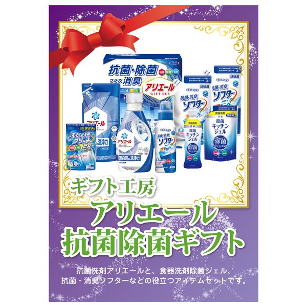 抗菌洗剤アリエールと、少量でたくさん洗える濃縮タイプの食器洗剤除菌ジェル、室内干しのイヤなニオイを防ぎ、ふっくら柔らかく仕上がる抗菌・消臭ソフターのギフトです。日々の暮らしを快適にしてくれる便利なアイテムをそろえました。