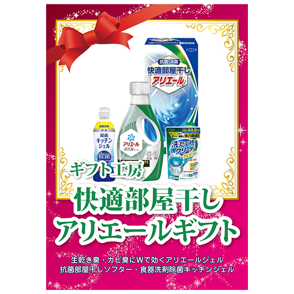| 内容 | P&gアリエールジェル部屋干しプラス690g・除菌キッチンジェル200ml・洗たく槽クリーナーNEO100g×各1 A4パネル×1 |