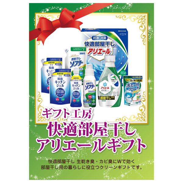 | 内容 | P&gアリエールジェル部屋干しプラス690g・除菌キッチンジェル200ml・抗菌部屋干しソフター350g・抗菌部屋干しソフター(詰替)300g・洗たく槽クリーナーNEO100g×各1、除菌キッチンジェル(詰替)160ml×2 A4パネル×1 |