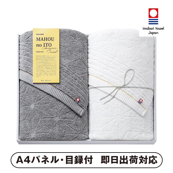 高品質な今治極選「魔法の糸」バスタオル2枚セット。洗うごとに柔らかさが増す世界初の特殊糸を使用し、ふんわりとした上質な肌触りを実感できます。日常の使用にも贈り物にも最適で、特別感を添える贅沢なタオルギフトです。