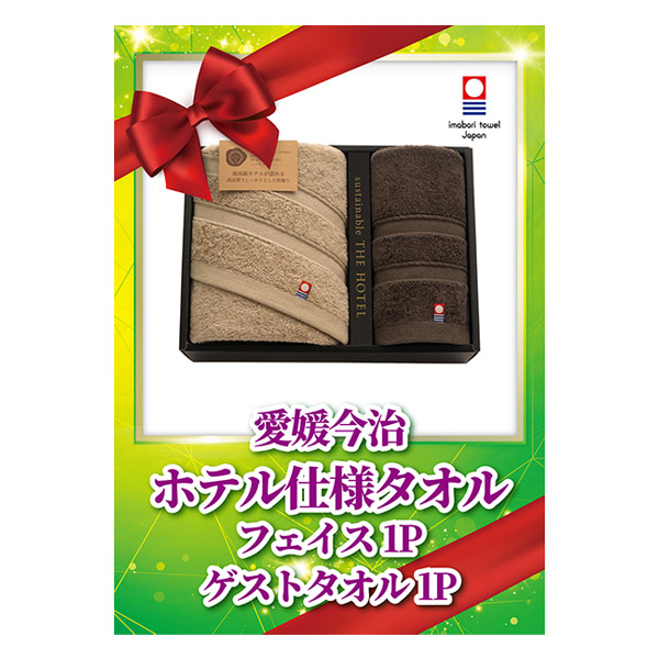 厚みがあり肌触りの柔らかな愛媛今治のホテル仕様タオルセット。フェイスタオル1枚とゲストタオル1枚で、耐久性にも優れ、太陽光発電で織るサステナブルな取り組みも魅力です。日常使いから贈り物まで幅広く喜ばれる上質タオルです。