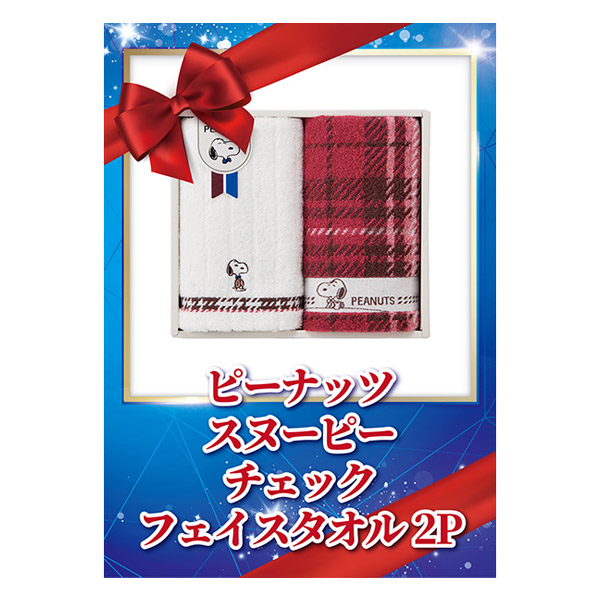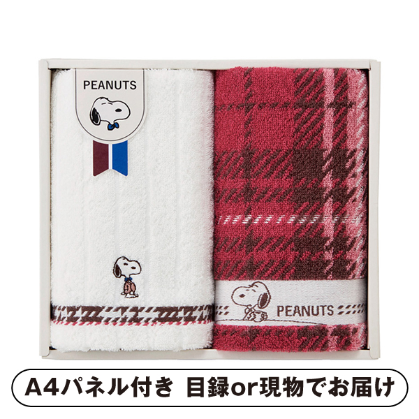 どこか懐かしく、あたたかな雰囲気をもつタータンチェック。チェックファッションに身を包んだスヌーピーが、ゆったりとティータイムを楽しんでいるアートをさりげなくあしらったタオルギフトです。