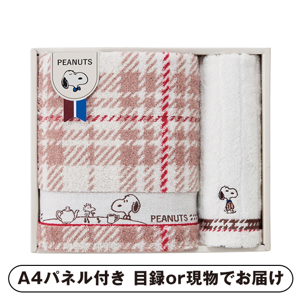 どこか懐かしく、あたたかな雰囲気をもつタータンチェック。チェックファッションに身を包んだスヌーピーが、ゆったりとティータイムを楽しんでいるアートをさりげなくあしらったタオルギフトです。