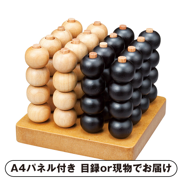 16本の棒に球を順番に差し置いていきます。縦・横・斜めと自分の球を4つ直線で並べて勝敗を決める。立体的に事を捉えて先を読む。簡単なルールながら奥深いゲームです。