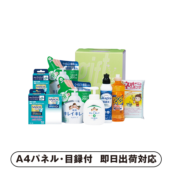 | 内容 | ライオンキレイキレイ薬用液体ハンドソープ(詰替用)200ml・ライオンNANOX one PRO(10g×6袋)×各2、ライオンCHARMY Magica除菌+220ml・オレンジマイルドコンパクト270ml・ライオンキレイキレイ薬用液体ハンドソープ(本体)250ml・ライオンNANOX one PRO(10g×2袋)・ネットスポンジ1P×各1 A4パネル×1 |