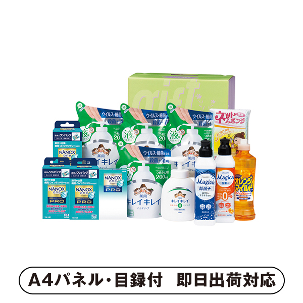 | 内容 | ライオンキレイキレイ薬用液体ハンドソープ(詰替用)200ml×4、ライオンNANOX one PRO(10g×6袋)×3、ライオンCHARMY Magica除菌+220ml・ライオンCHARMY Magica酵素+オレンジの香り220ml・オレンジマイルドコンパクト270ml・ライオンキレイキレイ薬用液体ハンドソープ(本体)250ml・ライオンNANOX one PRO(10g×2袋)・ネットスポンジ1P×各1 A4パネル×1 |