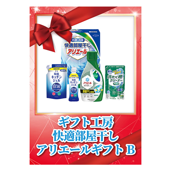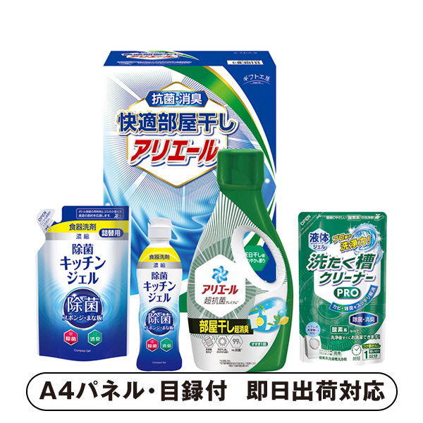 | 内容 | P&Gアリエールジェル部屋干し超消臭700g・除菌キッチンジェル200ml・除菌キッチンジェル(詰替)160ml・液体洗たく槽クリーナーPRO200g×各1 A4パネル×1 |