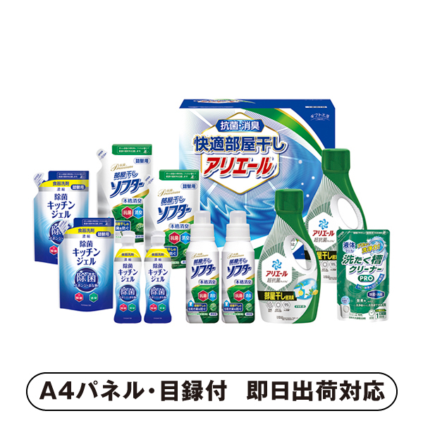 | 内容 | P&Gアリエールジェル部屋干し超消臭700g・除菌キッチンジェル200ml・除菌キッチンジェル(詰替)160ml・抗菌部屋干しソフター300g・抗菌部屋干しソフター(詰替)300g×各2、液体洗たく槽クリーナーPRO200g×1 A4パネル×1 |