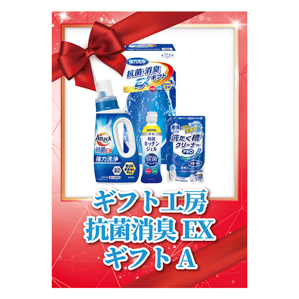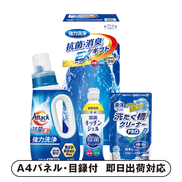 | 内容 | 花王アタック抗菌EX750g・除菌キッチンジェル200ml・液体洗たく槽クリーナーPRO200g×各1 A4パネル×1 |