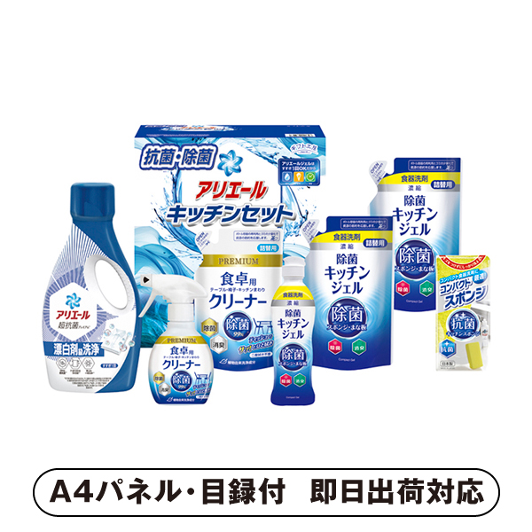 | 内容 | P&Gアリエールジェル700g・除菌キッチンジェル200ml・食卓用クリーナー260ml・食卓用クリーナー(詰替)250ml・コンパクトスポンジ×各1、除菌キッチンジェル(詰替)160ml×2 A4パネル×1 |