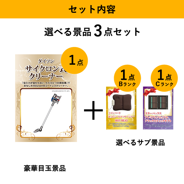 「Dysonサイクロン式クリーナー」をメイン景品とした、メイン景品1点と選べるサブ景品2点を合わせたセット!