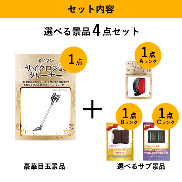 「Dysonサイクロン式クリーナー」をメイン景品とした、メイン景品1点と選べるサブ景品3点を合わせたセット!