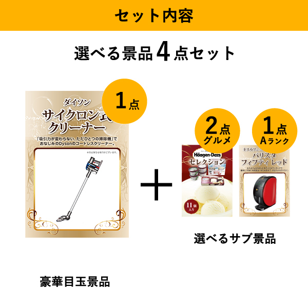 「Dysonサイクロン式クリーナー」をメイン景品とした、メイン景品1点と選べるサブ景品3点を合わせたセット!