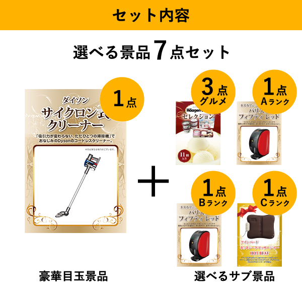 「Dysonサイクロン式クリーナー」をメイン景品とした、メイン景品1点と選べるサブ景品6点を合わせたセット!