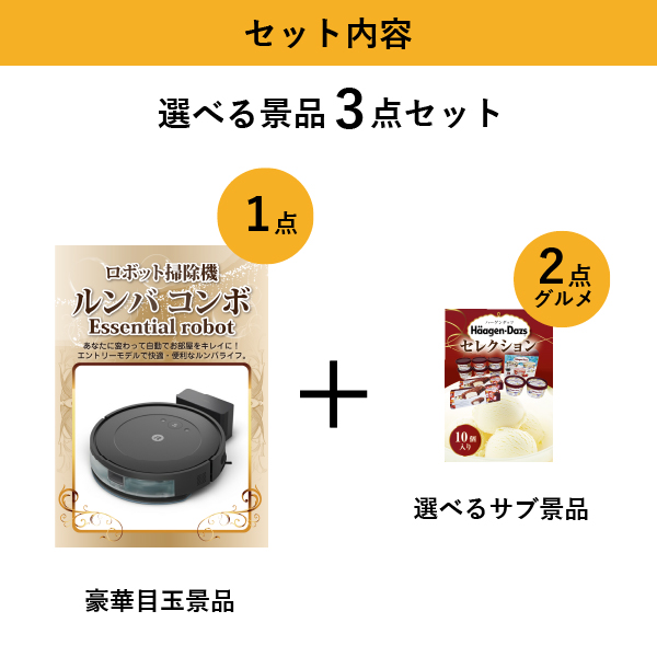 「ロボット掃除機 ルンバ」をメイン景品とした、メイン景品1点と選べるサブ景品2点を合わせたセット!