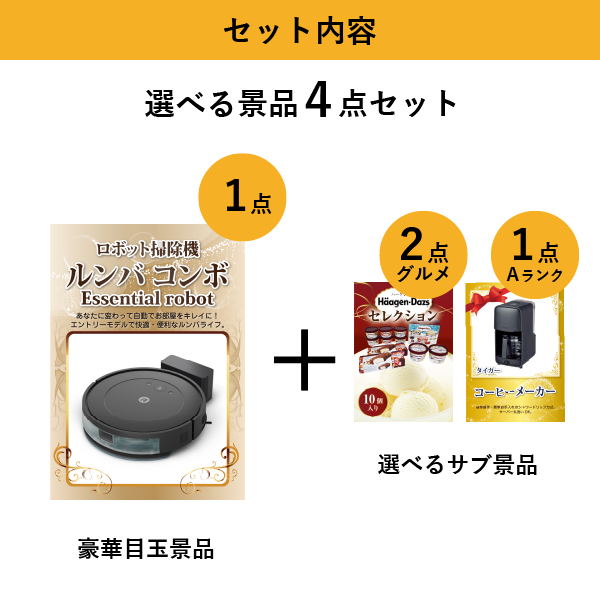 「ロボット掃除機 ルンバ」をメイン景品とした、メイン景品1点と選べるサブ景品3点を合わせたセット!