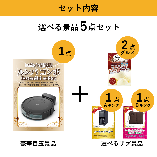 「ロボット掃除機 ルンバ」をメイン景品とした、メイン景品1点と選べるサブ景品4点を合わせたセット!