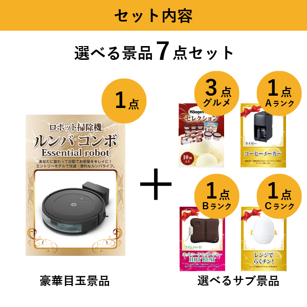 「ロボット掃除機 ルンバ」をメイン景品とした、メイン景品1点と選べるサブ景品6点を合わせたセット!