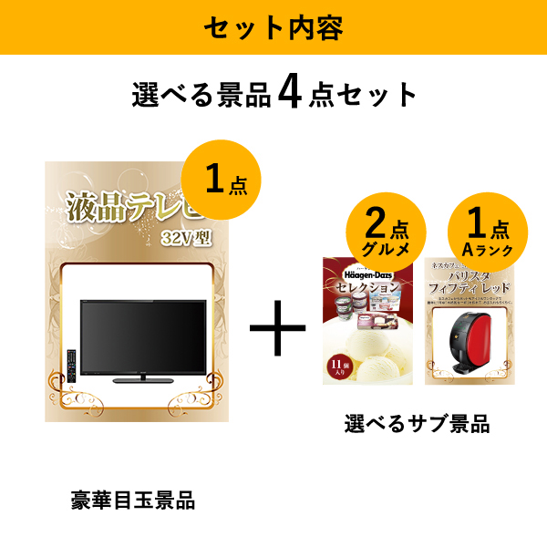 「32型液晶テレビ」をメイン景品とした、メイン景品1点と選べるサブ景品3点を合わせたセット!